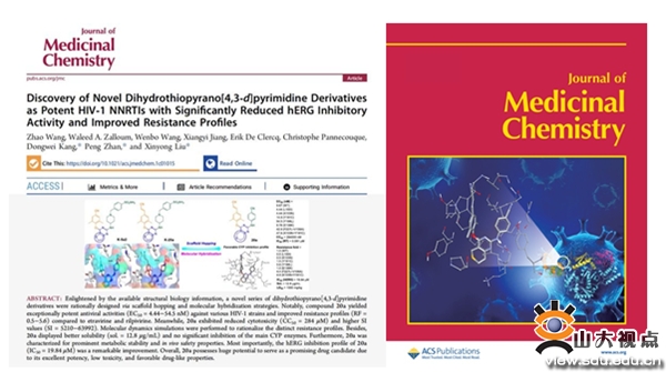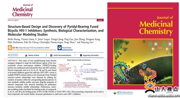 近日,药学院刘新泳展鹏团队在高效抗耐药性抗艾滋病药物研究领域取得系列新进展,相关研究成果以“Discovery of Novel Dihydrothiopyrano[4,3-d]pyrimidine Derivatives as Potent HIV-1 NNRTIs with Significantly Reduced hERG Inhibitory Activity and Improved Resistance Profiles”以及“Structure-Based Design and Discovery of Pyridyl-Bearing Fused Bicyclic HIV-1 Inhibitors: Synthesis, Biological Characterization, and Molecular Modeling Studies”为题在药物化学领域国际权威期刊Journal of Medicinal Chemistry(中科院JCR期刊1区)上连续发表,两篇论文均入选封面文章。威尼斯欢乐娱人v3676药学院博士研究生汪昭和毕业生黄伯世博士(现为美国Virginia Commonwealth University博士后研究员)分别为两篇论文的第一作者,刘新泳教授和展鹏教授为两篇论文的通讯作者,康东伟研究员为第一篇论文的共同通讯作者,威尼斯欢乐娱人v3676为第一通讯单位。