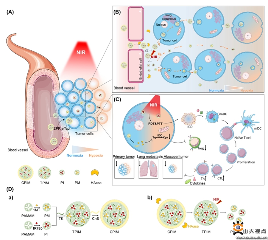 对肿瘤组织深部渗透不足,限制了纳米药物的治疗作用。面对这一挑战,威尼斯欢乐娱人v3676翟光喜教授和杨小叶副研究员团队制备了一种集簇型纳米制剂,首次将粒径转换和转胞吞作用策略相结合,进而有效地增强被动扩散和主动转运。在被动扩散方面,集簇型纳米颗粒(135 nm)在肿瘤微环境(TME)高活性氧(ROS)浓度作用下释放载药小“粒子”(负载光敏剂IR780/1-甲基色氨酸(1MT)的聚酰胺胺(PAMAM)纳米粒,粒径<10 nm),促进IR780和1MT在肿瘤组织内渗透扩散。IR780在近红外照射下产生ROS,可进一步增强这一响应性。这种NIR光触发的自摧毁行为也使得该集簇纳米制剂具有时空可控性。在主动转运方面,实验也证明该纳米制剂可通过转胞吞作用进行递送。在抗肿瘤作用方面,该制剂能够有效增强IR780的光动力学/光热治疗活性以及1MT对吲哚胺-2,3-双加氧酶(IDO)通路的抑制作用,从而对原发肿瘤表现出显著的抑制作用。此外,该纳米制剂还能诱导免疫原性细胞死亡,将“冷”免疫抑制性的肿瘤微环境(TME)变成“热”免疫原性的TME,进而启发体内免疫治疗作用。该研究可为构建具有高效的肿瘤杀伤作用和抗肿瘤免疫性能的纳米药物提供新的借鉴。