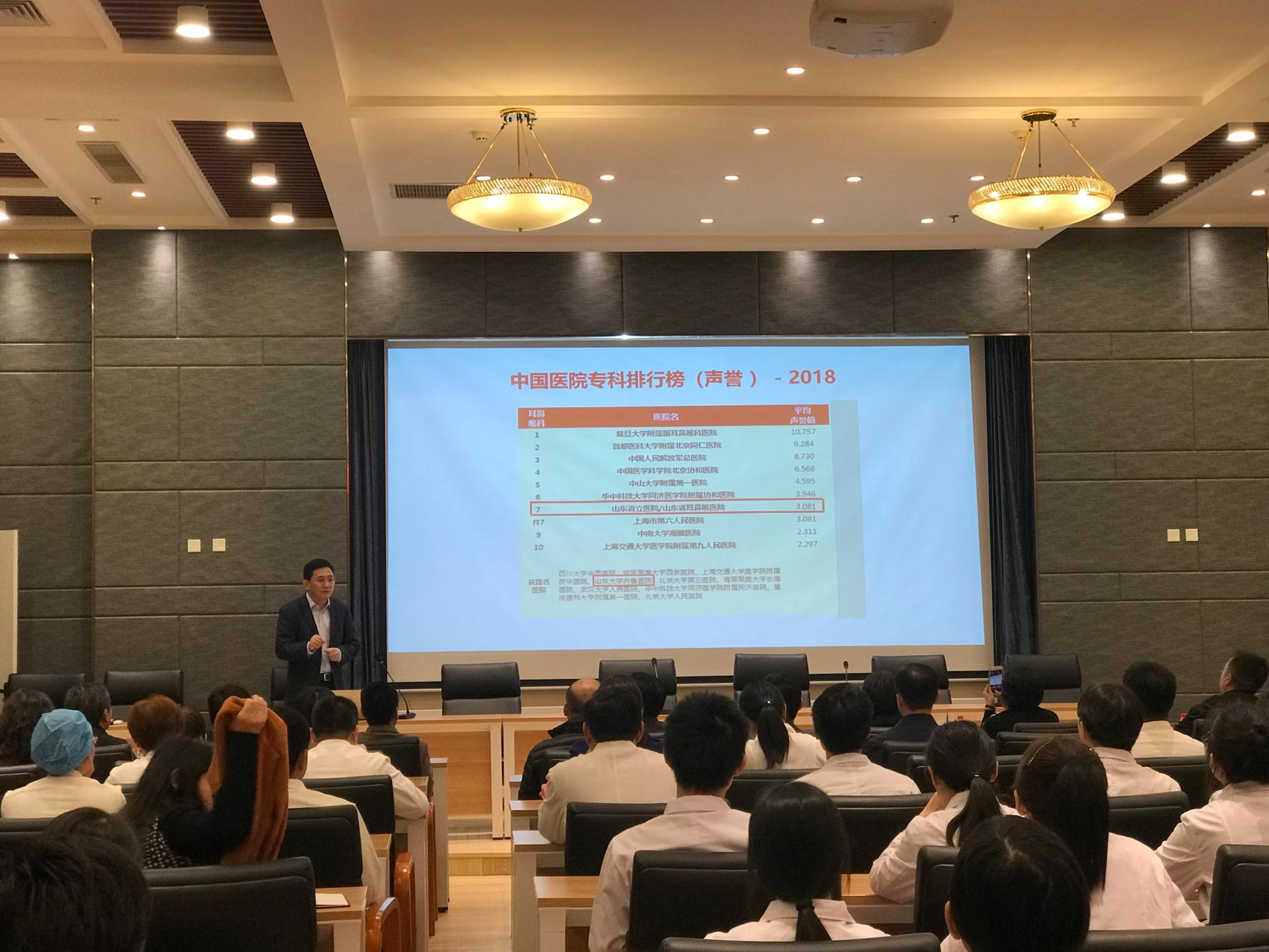 贾继辉为山东省耳鼻喉医院职工做了题为“临床医学五维度驱动区域发展”的专题讲座。他从人才培养、科学研究、医疗服务、文化创新、国际合作五个维度全面阐述了如何释放大学功能,服务区域健康,以推动大学与医院深度交流合作,共同服务社会,造福人民,助力“健康中国”和“健康山东”建设。