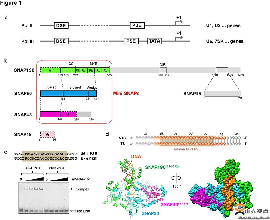 综上所述,本研究展示了mini-SNAPc/hU6-1 PSE复合物精确的分子模型,不仅解释了U6 snRNA转录起始的分子机理,也为研究SNAPc依赖性启动子(例如U6,H1等)的转录起始复合物组装提供了研究模板,未来可为设计更为高效的siRNA或CRISPR基因编辑系统提供数据支撑。