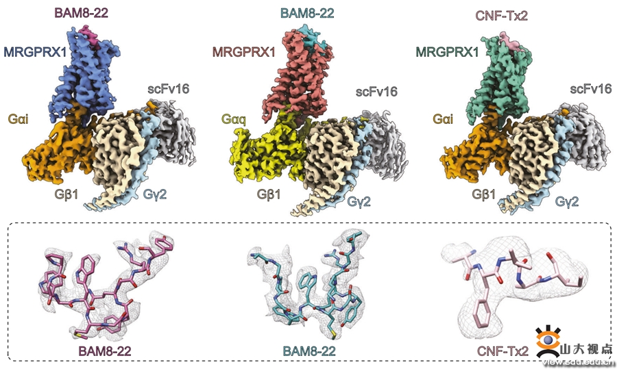 不同配体作用下痒觉受体MRGPRX1与Gi和Gq蛋白三聚体复合物的结构