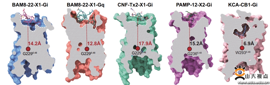 研究团队利用单颗粒冷冻电镜技术解析了2种不同配体作用下MRGPRX1与Gi及Gq蛋白三聚体复合物的结构,发现了痒觉受体独特的结构及配体结合口袋,这与课题组前期解析的同家族MRGPRX2受体的结合口袋特征相似(Nature. 2021 Dec;600(7887):164-169),表明可塑性显著的浅结合口袋是这一类受体的共同特征。