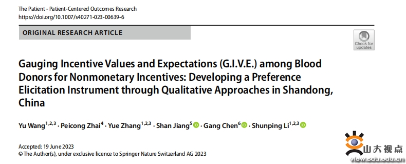 离散选择实验的属性和水平设置是研究设计的关键,本研究通过文献综述、定性访谈、属性排序等研究方法确定献血者的潜在非金钱激励因素,并通过认知访谈和预实验评估了DCE问卷的可理解性和接受性。此项研究为探索献血的非金钱激励因素提供了宝贵见解,同时研究结果表明认知访谈与预实验对提高DCE研究设计具有重要价值,为后续相关研究提供了方法学参考与借鉴。上述研究成果以“Gauging Incentive Values and Expectations (G.I.V.E.) among Blood Donors for Nonmonetary Incentives: Developing a Preference Elicitation Instrument through Qualitative Approaches in Shandong, China”为题,发表于健康偏好领域期刊The Patient-Patient Centered Outcomes Research(中科院2区,IF=3.6)上,威尼斯欢乐娱人v3676为第一和通讯作者单位,公共卫生学院卫生管理与政策研究中心硕士研究生王玉为第一作者,李顺平教授为独立通讯作者。