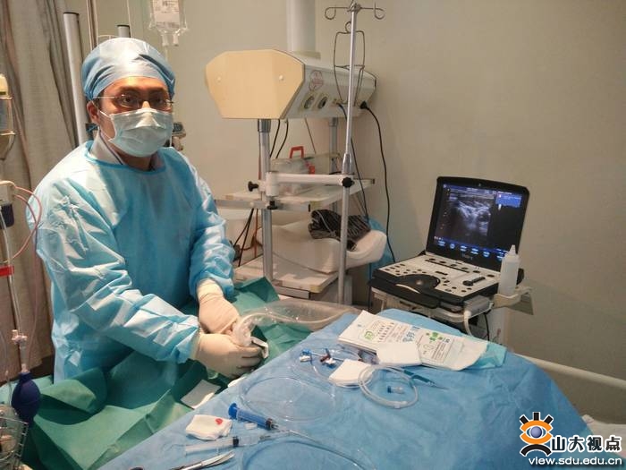 “患者心源性休克、血压不稳,注意心肌酶,上球囊反搏,托住器官功能……”,深夜一位外地患者被转到齐鲁医院重症医学科。郭海鹏迅速起身,快步走进病房,一边紧盯着设备上的各项危险值,一边指导医护人员紧急处理。