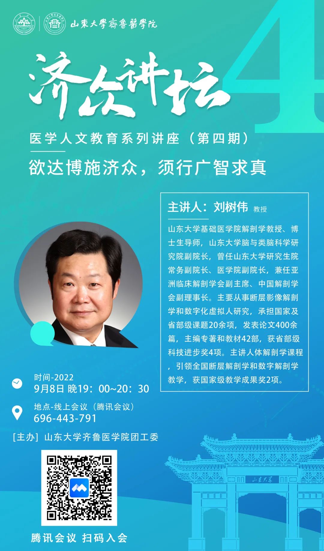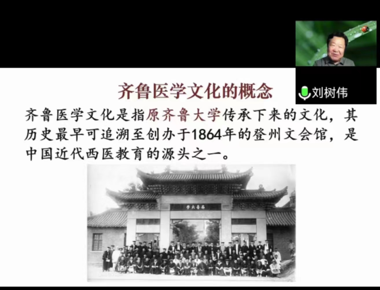 纵观其发展历程,齐鲁医学文化历久弥新,齐鲁医学精神深入人心。本次讲座旨在帮助2022级新同学更深层次了解齐鲁医学史,领悟齐鲁医学文化内涵,更激励着齐鲁萌新们践行博施济众 广智求真的院训精神,自觉成为山大精神和齐鲁医学精神的传承者和弘扬者。
