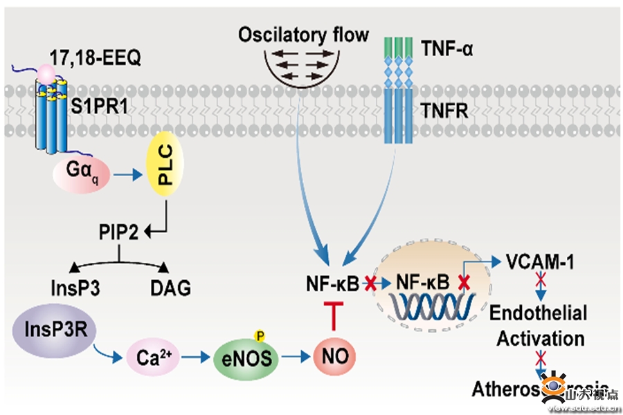在这项研究中,研究人员首先明确了17,18-EEQ能够低于EPA 100倍的剂量抑制湍流或TNF-α诱导的内皮激活。随后通过siRNA文库筛选,放射性配体竞争结合实验鉴定出S1PR1作为17,18-EEQ的受体介导其抗炎作用。17,18-EEQ通过S1PR1偏向性激动Gq信号,增加细胞内Ca2+浓度,促使eNOS转化为激活状态,促进NO释放从而抑制VCAM-1表达。