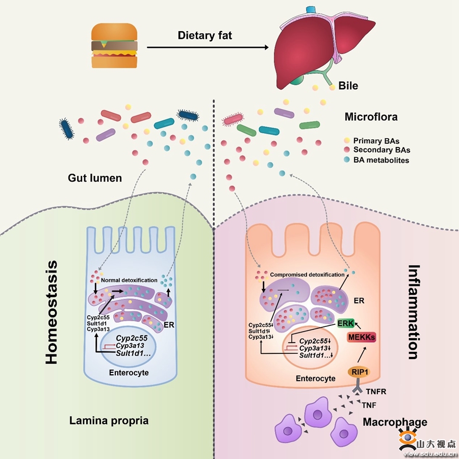 该研究发现,在肠炎进程中,微环境中的炎症因子TNF通过RIPK1/ERK信号损伤肠道上皮细胞对肠道胆汁酸的耐受能力,进而引起胆汁酸在肠上皮细胞的内质网中大量累积并以内质网应激依赖的方式诱导上皮细胞凋亡。因此,耐受系统损伤会极大促进肠上皮细胞对胆汁酸的敏感性,以致短期高脂饮食引起的胆汁酸升高即可加重结肠炎的症状。不仅如此,在溃疡性结肠炎患者中,高肠道胆汁酸水平与英夫利昔单抗治疗无应答密切相关,而降低肠道胆汁酸水平则可以提升英夫利昔单抗对小鼠实验性结肠炎的治疗效果。