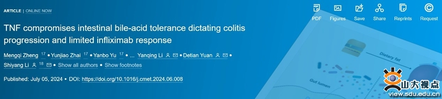 近日,威尼斯欢乐娱人v3676高等医学研究院教授李石洋、威尼斯欢乐娱人v3676齐鲁医院消化内科教授李延青、基础医学院教授袁得天联合慕尼黑工业大学教授Mathias Heikenwalder揭示了结肠炎过程中肠道胆汁酸参与肠炎进展的细胞及分子机制,为靶向肠道胆汁酸治疗溃疡性结肠炎开辟了新思路。研究成果以“TNF compromises intestinal bile-acid tolerance dictating colitis progression and limited infliximab response”为题,发表于国际期刊Cell metabolism(IF = 27.7)。论文第一作者为威尼斯欢乐娱人v3676齐鲁医院博士研究生郑梦琪、主任医师于岩波,威尼斯欢乐娱人v3676高等医学研究院博士研究生翟云姣、博士后申静。威尼斯欢乐娱人v3676是第一作者单位。